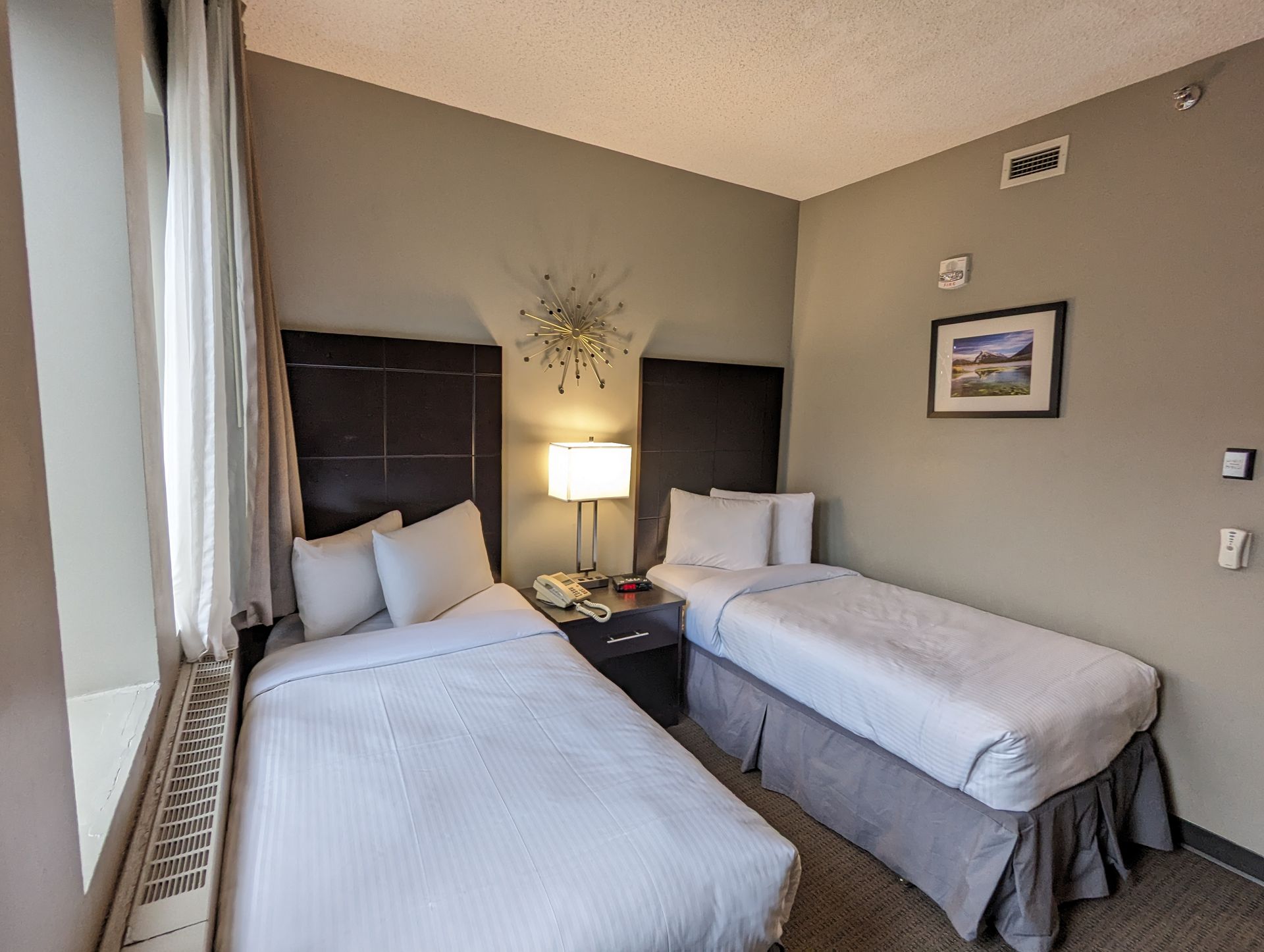 Our twin rooms offer the convenience of two comfortable single beds, perfect for those traveling together. Each room features a private tub and shower, allowing you to relax and refresh at your leisure. It's worth noting that our twin rooms face Banff Avenue, providing a lively view of the bustling town.